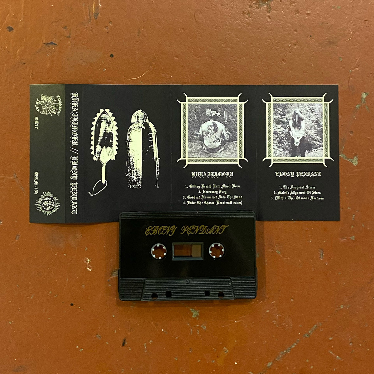 2nd edition of the Kūka'ilimoku//Ebony Pendant split cassette. 3-panel double-sided J-Card with updated art. Black cassette shells with gold pad print. Co-released by Forbidden Sonority & Expansion Abyss. Limited to 250 copies.